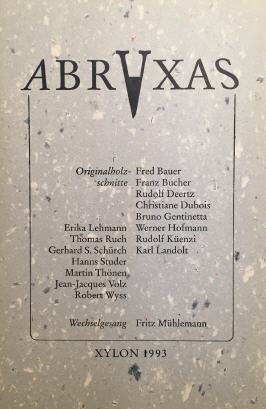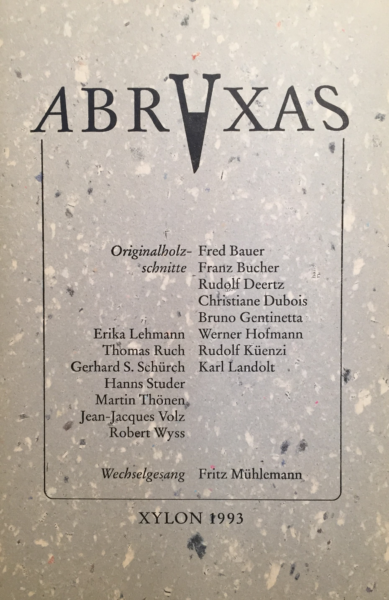 Titel: Abraxas | Mit Original-Holzschnitten von: Fred Bauer, Franz Bucher, Rudolf Deertz, Christiane Dubois, Bruno Gentinetta, Werner Hofmann, Rudolf Künzi, Karl Landolt, Erika Lehmann, Thomas Ruch, Gerhard S. Schürch, Hanns Studer, Martin Thönen, Jean-Jaques Volz, Robert Wyss. Wechselgesang von Fritz Mühlemann. |